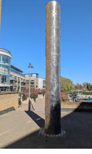 We'll end the arboricultural lecture there as your little mind can't grasp too much of this learned comment, but something else has worked its way into the picture. This splendid metal sculpture was put there as part of the planning permission. It is a popular place for fisher folk who dangle their lines into the Thames from the other side. It's a long wait for a fish to bite so sometimes a fisher needs relief and comes out to this side of the sculpture and dangles something else in the breeze to the amusement of those who live very near.