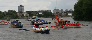 King Henry VIII and his Queen aboard the Royal Shallop ‘Jubilant’ , were followed by a splendidly attired entourage of Tudor courtiers and musicians in a flotilla of traditional shallops and Watermen’s cutters.