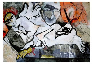 Suz describes her work as being composed of strong graphic figurative elements overlaid on hand-made papers, textures and metallic.