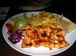 My partner had Shish Taouk - chicken marinated in Garlic, Lemon Juice and Olive Oil, grilled on skewers at £12.00 he expected a bit more than the fairly standard chicken kebab and chips in front of him.