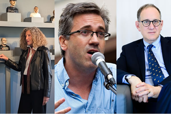 L–R: Nicole Farhi at J’Accuse…! alongside bust of Andrew Malkinson. Photo © Lucinda MacPherson; Matt Foot. Photo © Jess Hurd; Anthony Julius. Photo © Mishcon de Reya