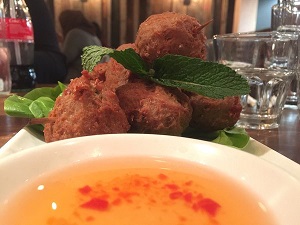 I had the nem nuong (pork & lemongrass meatballs) to start, which were delicious and quite substantial. They come with bright nuoc cham dipping sauce.