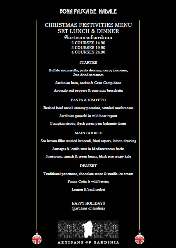 A festive menu and invitation to Christmas Eve or New Year's Eve at Artisans of Sardinia
