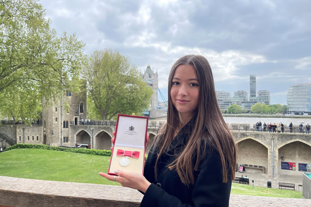 Nina, a Sixth Form student at Latymer Upper School in Hammersmith has collected her British Empire Medal (BEM) at a ceremony at the Tower of London.