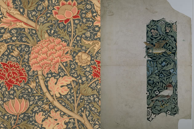 Left: 'Cray' Printed Cotton William Morris 1884 Right: Design for 'Bird' woven wool textile William Morris 1878